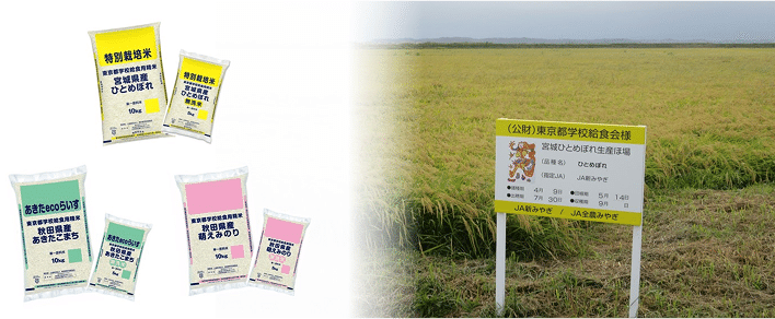 給食会の米穀は産地を指定し、うるち精米・無洗米については、特別栽培米(環境保全米)、農薬節減米(あきたecoらいす)・慣行栽培米をお届けしています。